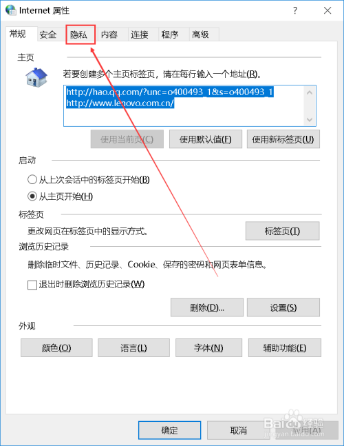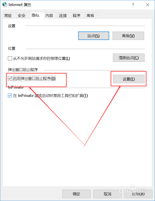在弹出的Internet属性窗口中,切换至“隐私”,我们可以看到弹出窗口阻止程序,点击勾选,并单击设置。
