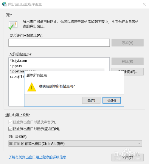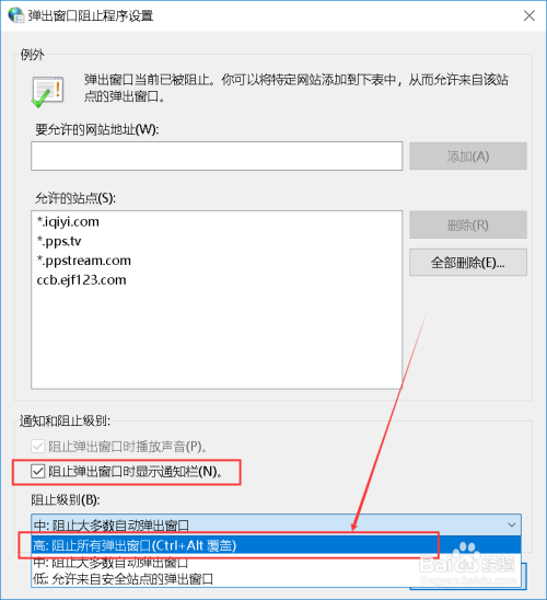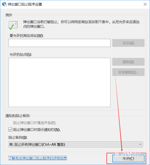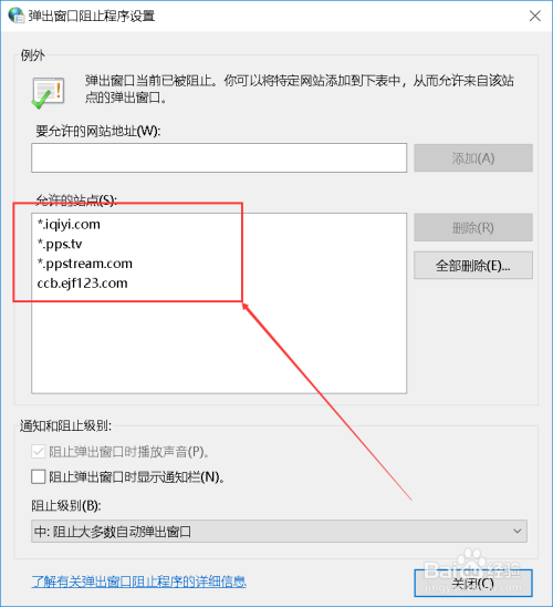 在设置窗口中,我们根据自己的需求设置允许弹出的窗口网站,以及删除已允许的站点,最后设置阻止窗口弹出的级别,如何十分厌恶小广告的推送,建议可以设置为最高级。