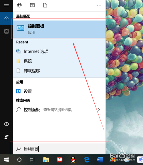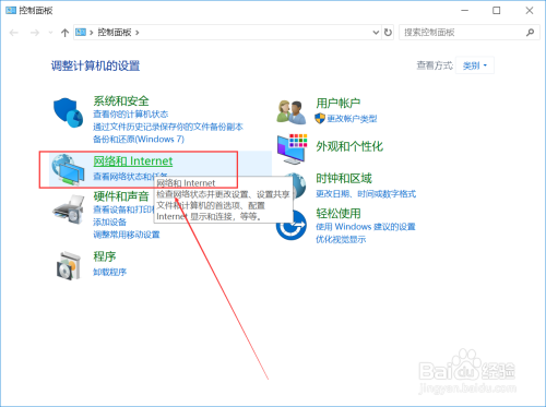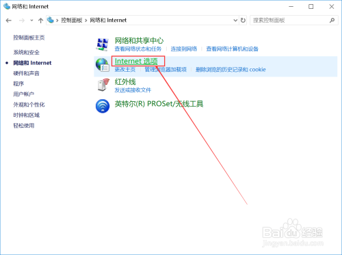 首先在桌面左下角打开搜索,输入控制面板,打开控制面板窗口,单击“网络和Intenet”跳转至该窗口,再点击Internet选项。