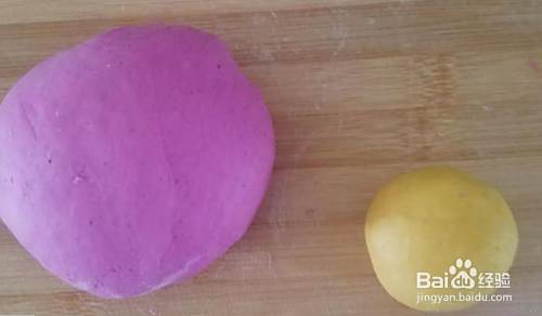火龙果汁80g,面粉200g,酵母2g和成红色面团,少量南瓜泥面粉加一点酵母和成黄色面团。