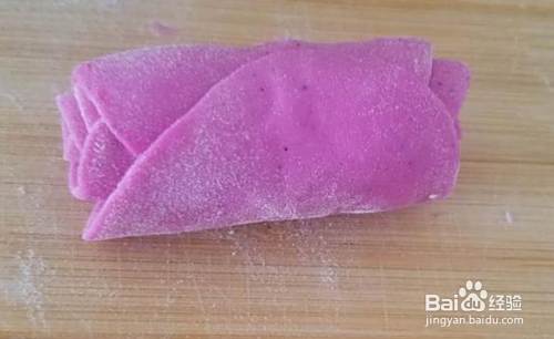 把剂子擀成饺子皮,五片层叠,加花心卷起。