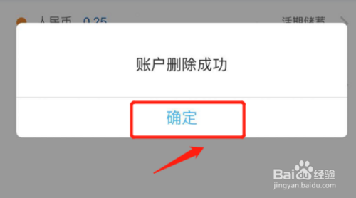 最后,在弹出的提示窗口中,点击右侧的【确定】按钮,即可成功在建设银行手机银行里,解绑银行卡了,如下图。