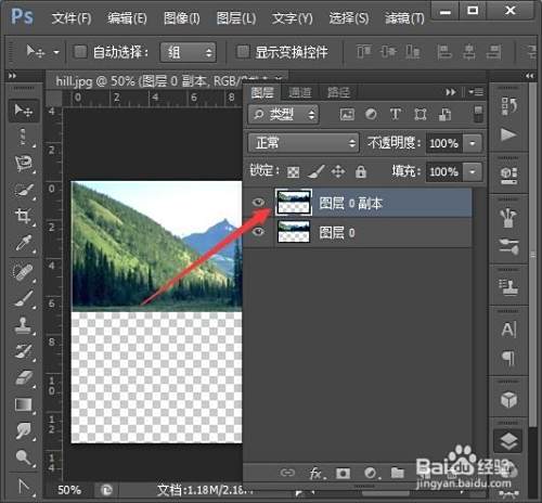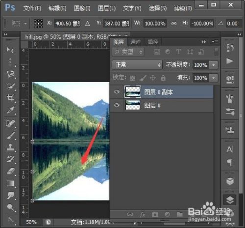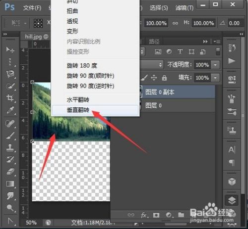 将图层0按右键复制图层,得到图层0副本。按Ctrl+T进入自由变换,再右击,选择垂直翻转。再将不透明度设置为50%
