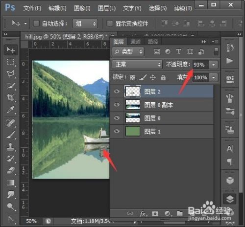 新建图层1,点击吸管工具,吸取山上的颜色,按Alt+Delete填充到图层1中,再把图层1拉到所有层的底部形成湖水。