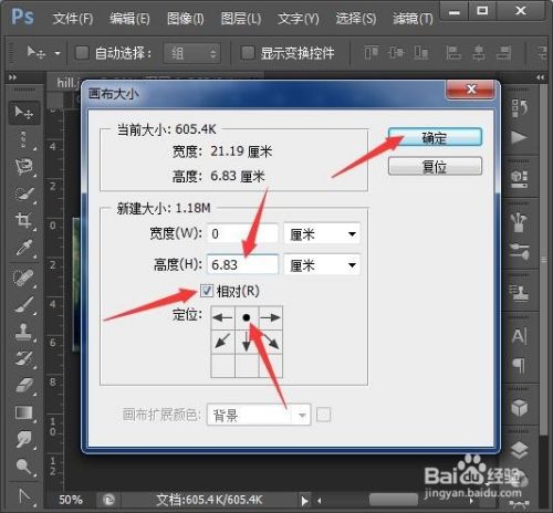 点击图像,画布大小,勾选相对,在定位中点击上排中间的格作为中点,高度处填入上面显示的高度。