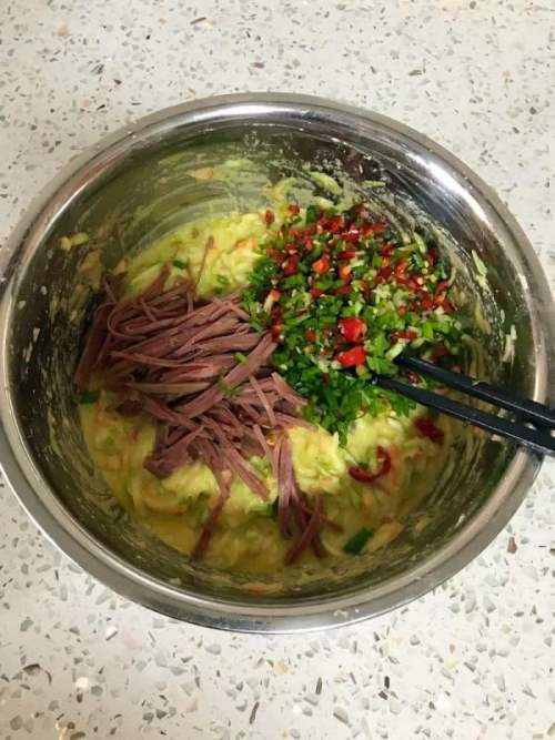 调匀后加入切成丝的火腿片,加葱花,如吃辣加点辣椒末