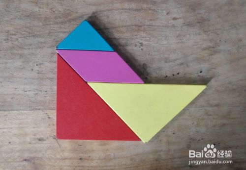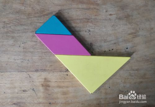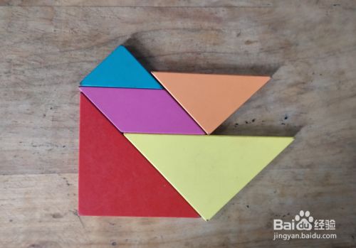 摆上余下的小三角形,放在中号三角形的上面挨着,右端一齐, 如图。