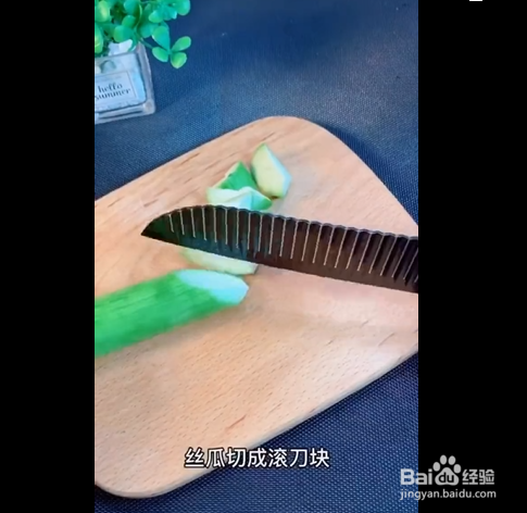 第1步,把准备好的丝瓜切成滚刀块,鸡蛋炒熟备用,另起锅爆香葱花,下丝瓜,丝瓜炒软,下入玉菇,倒入清水。