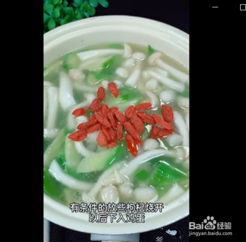 第2步,放入枸杞,水开后下入鸡蛋,加入盐,鸡精调味,丝瓜汤就做好了,你学会了吗?