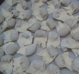 拿一张馄饨皮包适量盐,依次做好所有馄饨。