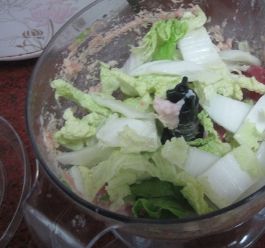 把猪肉和白菜都倒入绞肉机内搅碎。
