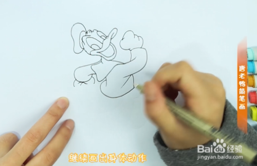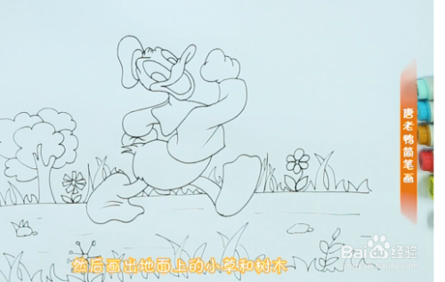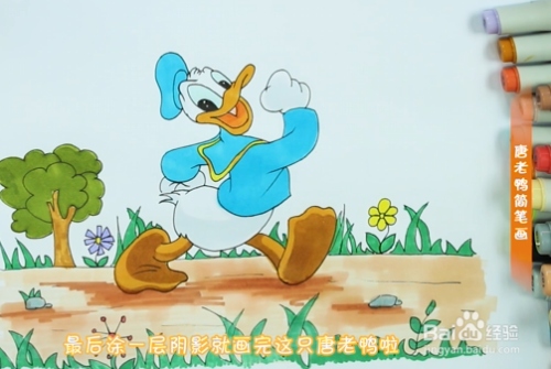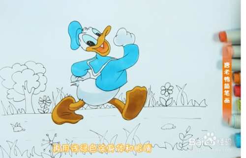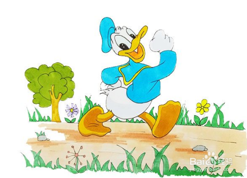 用浅蓝色画唐老鸭的衣服帽子,用深黄色和橙色涂嘴巴和脚丫子,浅灰涂身体和眼睛;