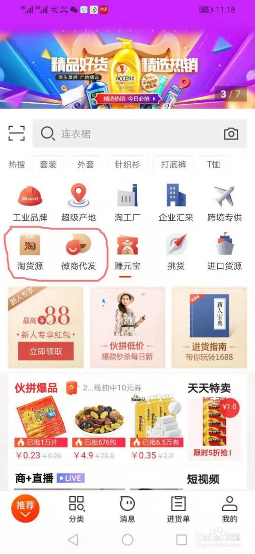 打开这个软件,登上你的淘宝账户,在首页你会看到“淘货源”、“微商代发”之类的东西,如下图。