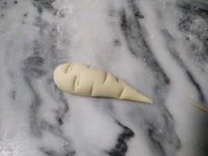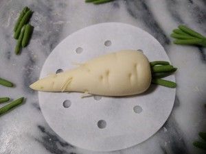 运用牙签把细条戳入萝卜里,当成须须。