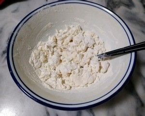 把中粉,水,酵母粉,糖,油,倒入大碗中,搅到棉絮状后,揉成团。