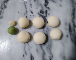 剩下的面团,再分出2克,待用。其余的加入菠菜粉,揉成绿面团。