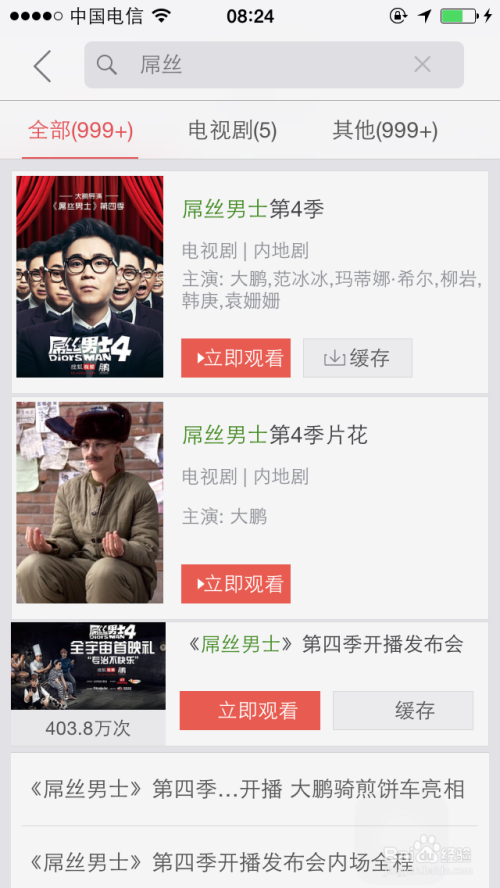 我们点击右上角的放大镜进行搜索,我们搜一个屌丝吧,就会出现结果,第一个就是,我们可以选择立即观看,或者缓存