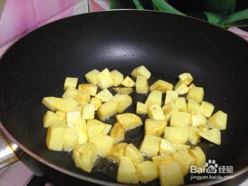 不粘锅加少量油倒入土豆丁中火煎至表皮