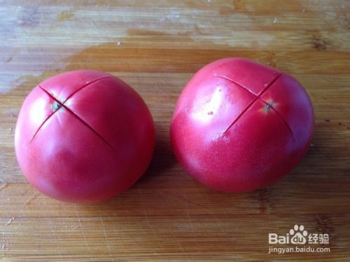西红柿顶部切十字刀,泡入开水1分钟去皮,很简