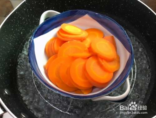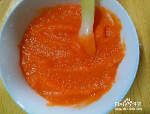 胡萝卜事先削去皮,将胡萝卜隔水放入锅中,蒸熟,放入料理机中,不用加水,直接启动程序将胡萝卜打成泥,胡萝卜泥盛出在,放一个大碗中