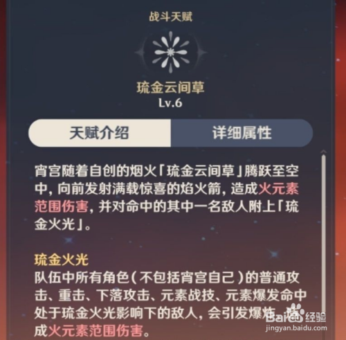 宵宫的大招是先造成一段火元素范围伤害,并且为一名敌人挂上琉金火光状态,在该状态持续时间里队伍中的角色(不包括宵宫)对其造成伤害时引发爆炸造成火元素范围伤害,该状态持续十秒。