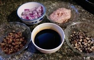 蒸糯米的时候准备其它食材,把生抽、老抽、蚝油、白糖、白酒倒入一个碗里调成汁待用,洋葱、香菇、香肠切成丁。