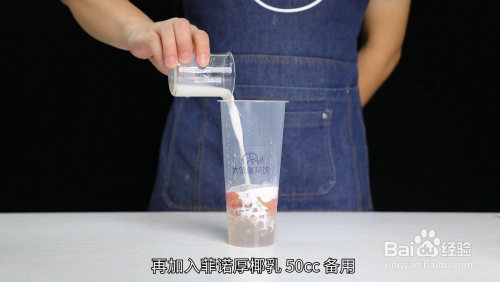 雪克杯中加入新鲜红心芭乐果肉 50g ,用黑色柠檬锤压碎后倒入出品杯中,出品杯中再加入菲诺厚椰乳 50cc 备用。