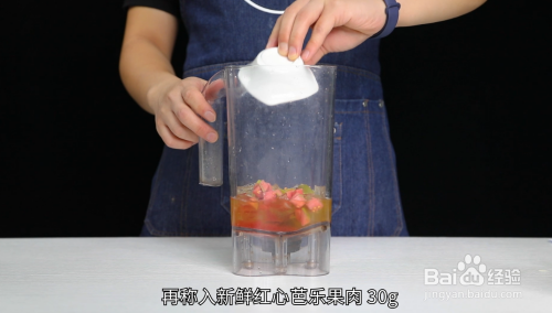 加冰到 400cc 刻度线后倒入冰沙桶中,再称入新鲜红心芭乐果肉30g,用冰沙 7 档打至停止。