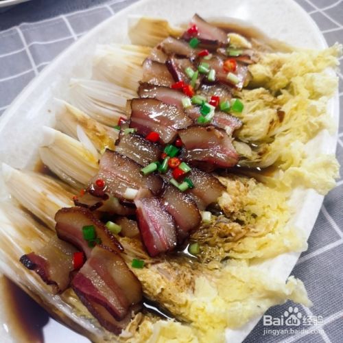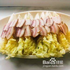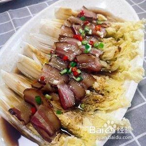 腊肉用温水清洗干净后切薄片摆在娃娃菜上,