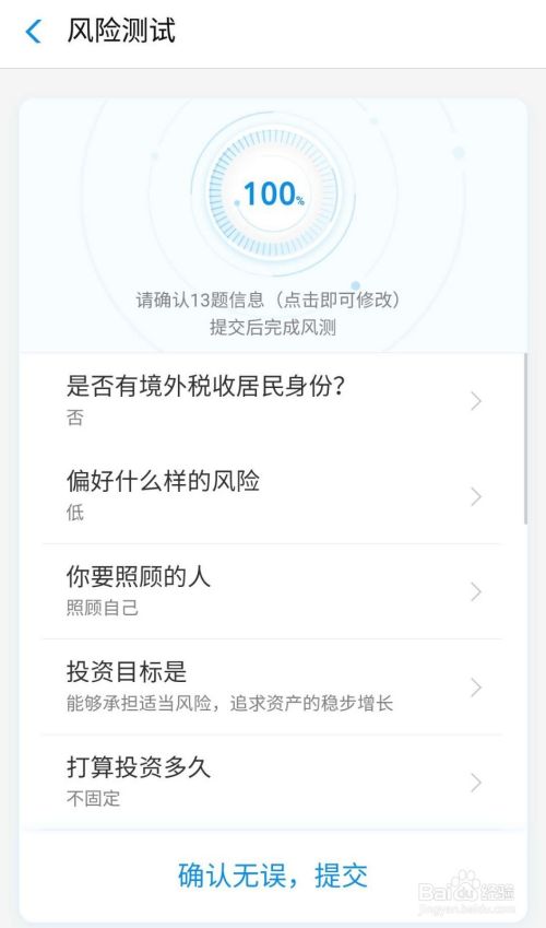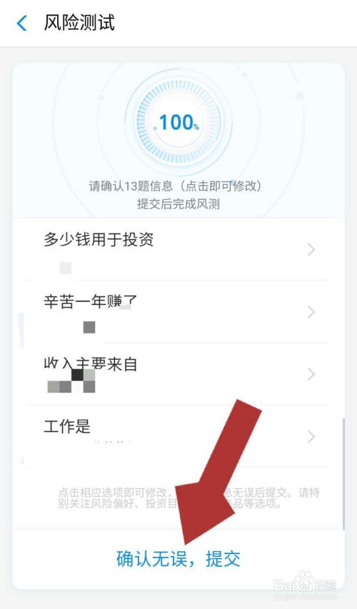 在风险测试页面,根据自己的实际情况回答题目问题,填写完成后,点击页面下方的“确认无误,提交”。