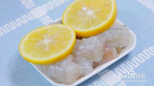 虾仁去除背部、腹部的虾线,放上柠檬片或者姜片,腌制15分钟去腥。