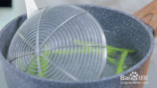 芦笋尖洗净,放入沸水锅中焯水至熟透,然后捞出。