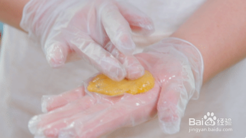 双手刷一层油或者清水防粘,取适量虾泥放在手中,整理成小饼状。