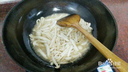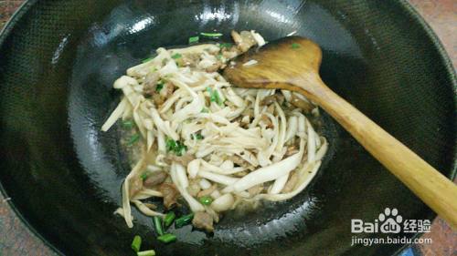 把肉装到碗里,炒肉剩下的油用来炒海鲜菇,然后放点盐,海鲜菇炒一会儿之后会出汁。(汁挺有营养的,就是装盘的时候估计不是很好看,所以任性的芥子把汤汁倒掉一半了)