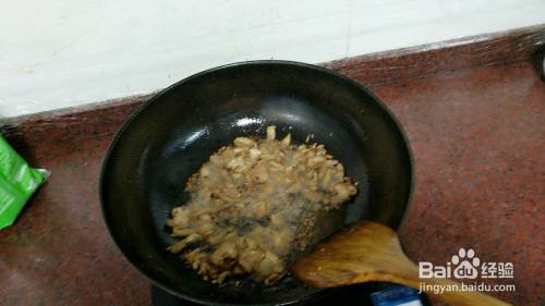 开火放一些油,量可以稍微多一点(有淀粉油太少会粘锅),油开始微微冒烟的时候放蒜末和姜末,然后放肉开始翻炒,炒一会后放料酒,料酒炒肉肉比较嫩比较香。