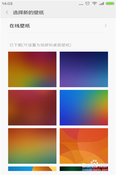然后我们会看到系统已经有给我们下载完的锁屏壁纸和桌面壁纸供我们使用,当然我们也可以点击上面的“在线壁纸”