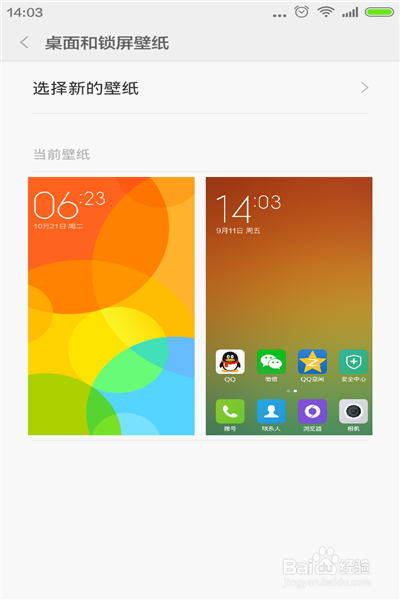 进到桌面和锁屏壁纸功能界面后,我们先看下面显示的是当前的壁纸,上面有一个功能是“选择新的壁纸”我们点进去