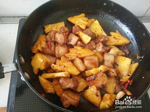 然后放菠萝片到锅空格,加适量的盐煸炒一下。