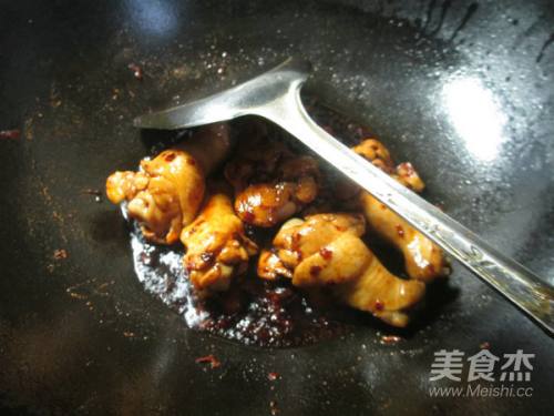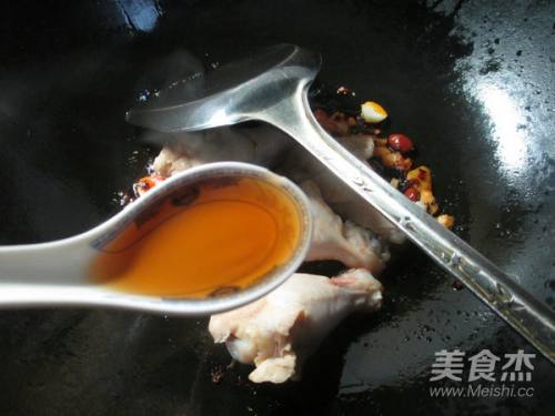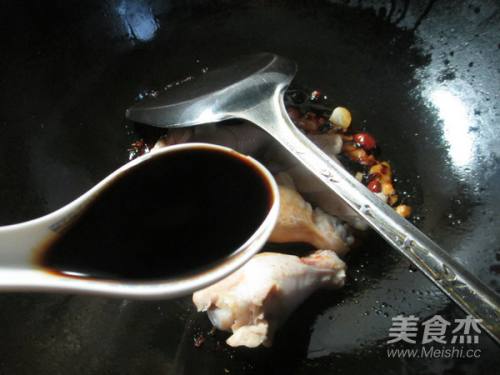 随后,下入焯好的鸡翅根,加2汤勺料酒。
