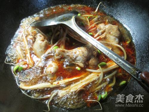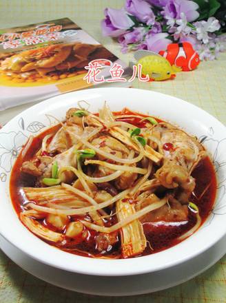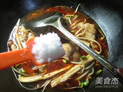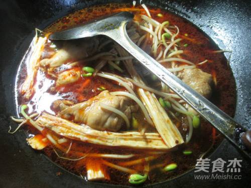然后,合入已清洗好的黄豆芽和腐竹翻动一下煮开。