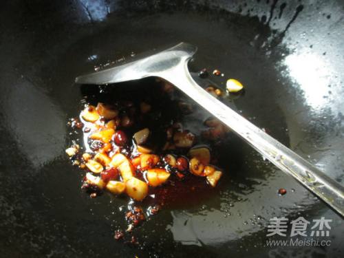 烧锅倒油烧热,下入已切碎的蒜头和油辣椒翻炒翻炒出香味。