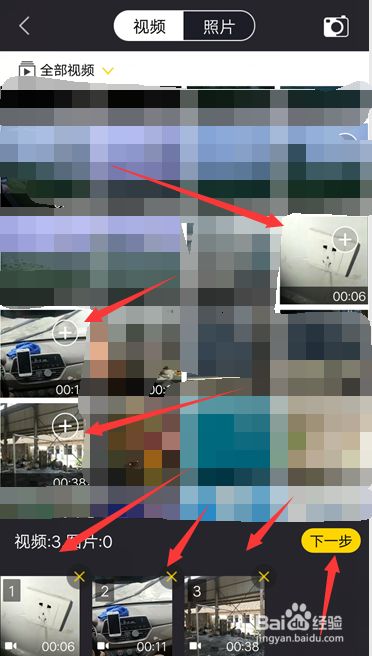 找到视频编辑功能,点开,选择几个素材,确认它们出现在底部栏,然后下一步。