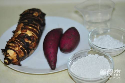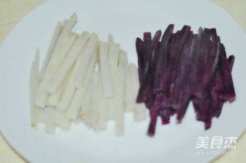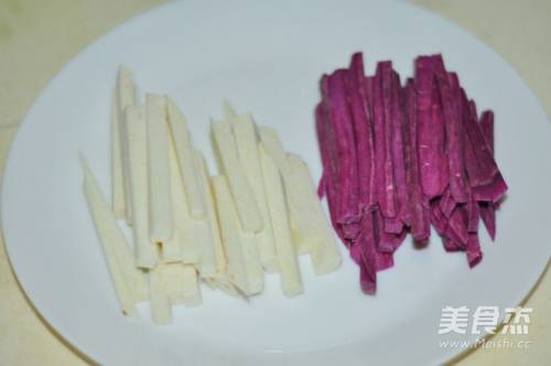 2芋头去皮洗净,切成细条状。紫薯去皮洗净,切成细条状。