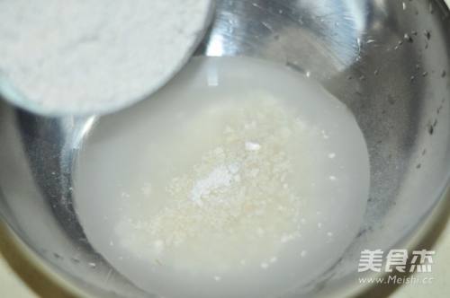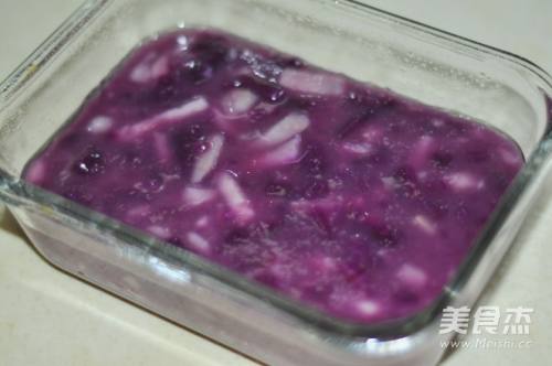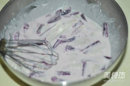 6芋头和紫薯蒸好后,趁热倒入红薯粉糊中,拌匀至黏稠状。
