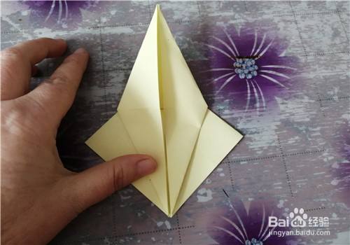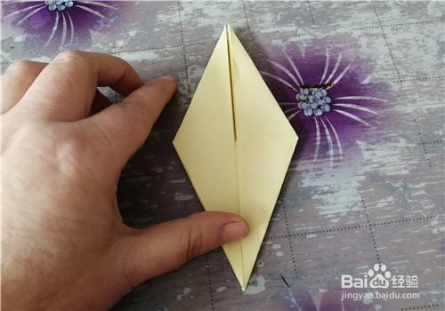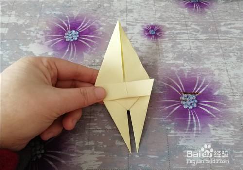 把彩纸转一下,我们把下侧的角向里折,背面的一样操作,如图。