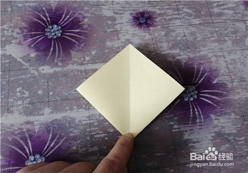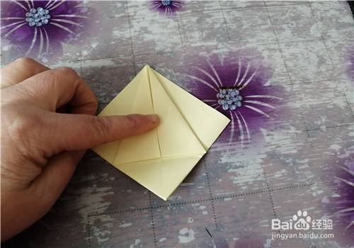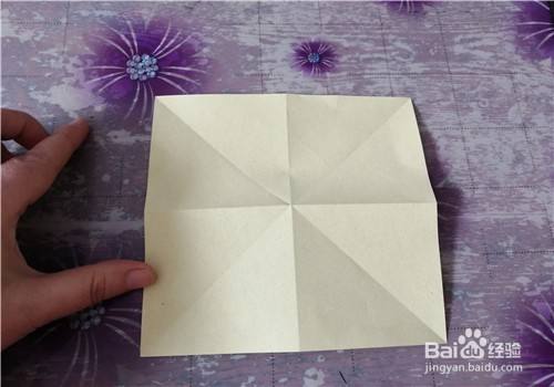 我们首先把彩纸的中间折出米字形,如图一。然后把彩纸按照折痕,折成图二的样子。