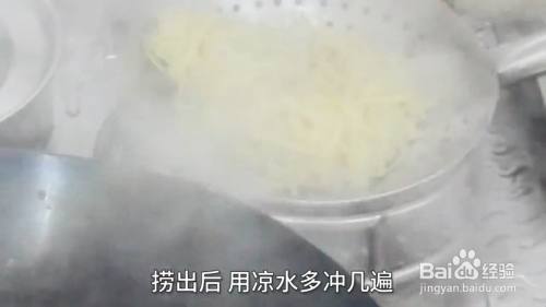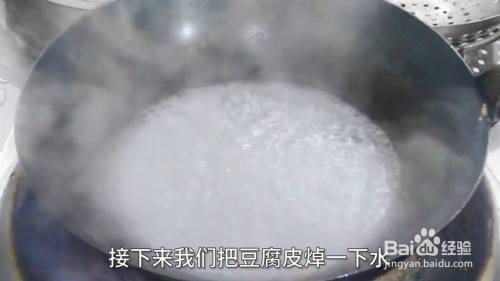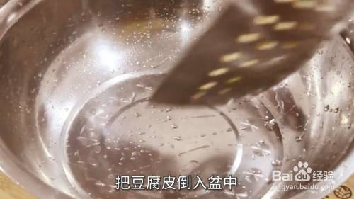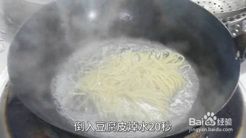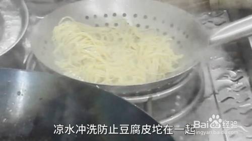 其次接下来我们把豆腐皮焯一下水,锅内烧水水烧开以后,倒入豆腐皮焯水20秒,捞出后用凉水多冲几遍,凉水冲洗防止豆腐皮坨在一起,把豆腐皮倒入盆中。