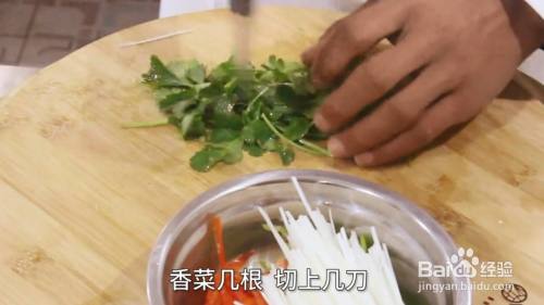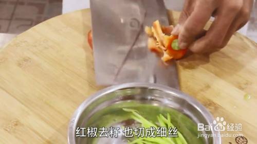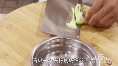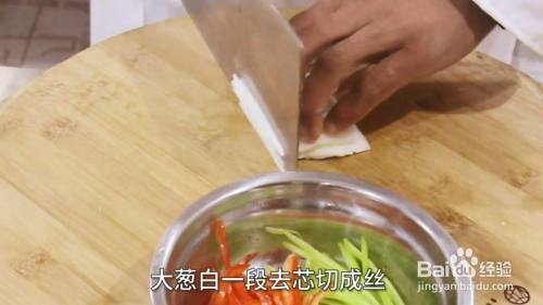 首先准备豆腐皮二张,从中间划开切成细丝,青椒一个去籽切成细丝,红椒去籽也切成细丝,大葱白一段去芯切成丝,香菜几根切上几刀。