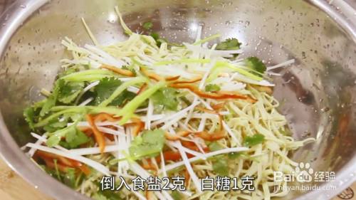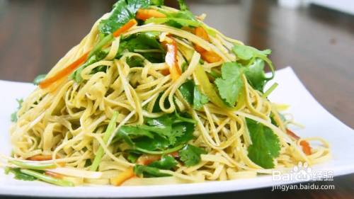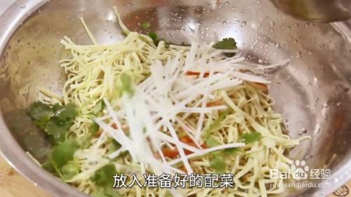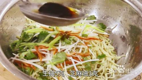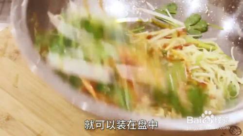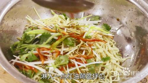 最后放入准备好的配菜,倒入食盐2克白糖1克,生抽5克芝麻油3克,淋入一点红油颠盆拌匀,就可以装在盘中了。