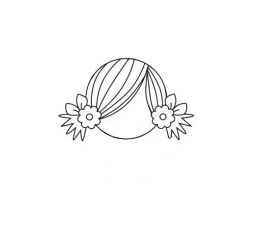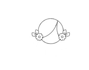 先画一个大大的圆,画出美人鱼的发型,三七分,在两只耳朵旁边各画一朵小花和两个叶子。